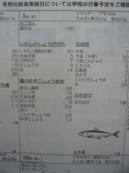 本日の給食の献立は、白ごはん、いわしのしょうがだれ、鶏のゆずこしょう炒め、五目豆、ふりかけ、牛乳です。