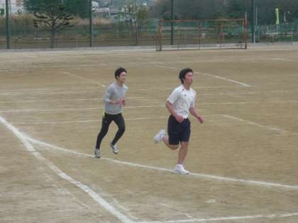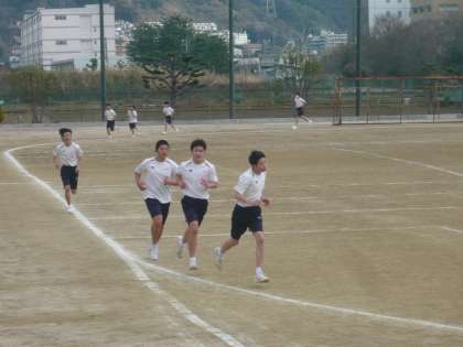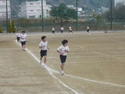 5限、3年3・4組は体育。男子は、グラウンドのトラックで1500mのタイムトライアルです。先生も激走しています。