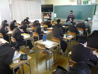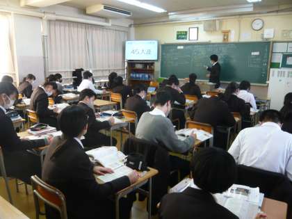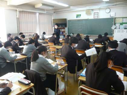 5限、2年1組は数学、平行四辺形の性質について学んでいます。2年2組は社会、日露戦争とポーツマス条約について学習しています。2年3組は理科、単元テストの最中でした。