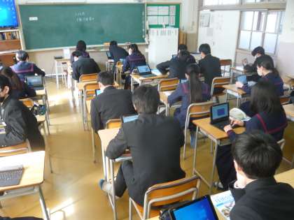 3限、3年生の技術と家庭の授業です。技術は、マグカップの絵柄の図案を考えています。家庭は動画を見て、消費生活におけるトラブルの対処について考えています。