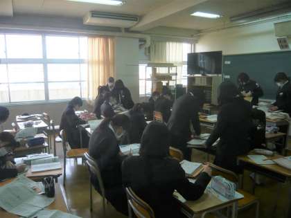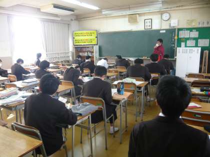 6限、1年3組の保健体育は、男女とも教室で行っています。