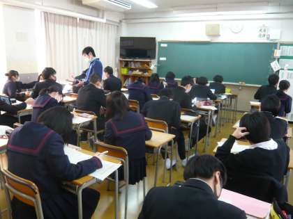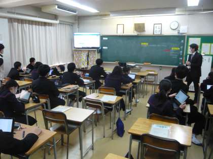 3限、3年3組は英語、タブレットで単語と文法の問題を解いています。3年4組は理科、過去の入試問題を解いています。