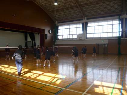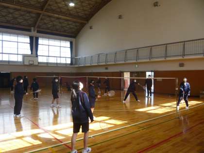 3限、2年1・2組の女子体育は、体育館でバドミントンです。
