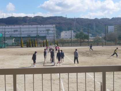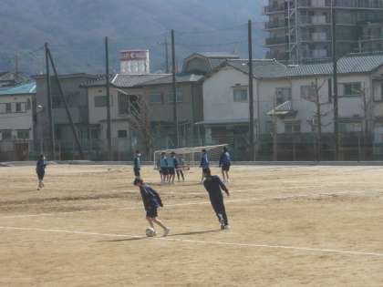3限、2年1・2組の男子体育は、グラウンドでサッカーです。みんなで準備しています。