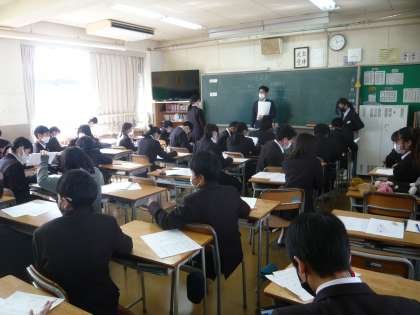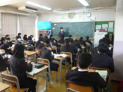 3限、1年1組は数学、円錐の表面積の求め方を学習しています。1年2組は音楽、歌の練習は2部屋に分かれて行います。男子は図書室で練習です。1年3組は社会、実力テスト返しです。