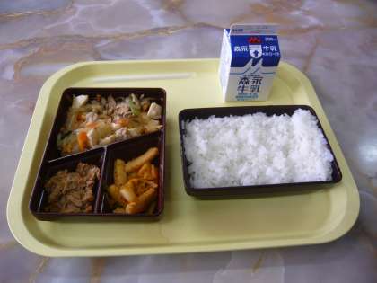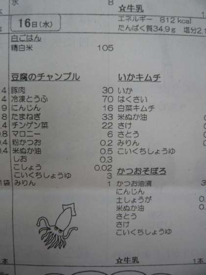 本日の給食の献立は、白ごはん、豆腐のチャンプル、いかキムチ、かつおそぼろ、牛乳です。