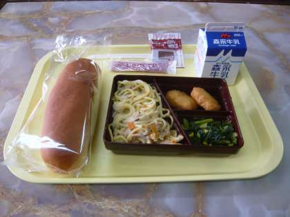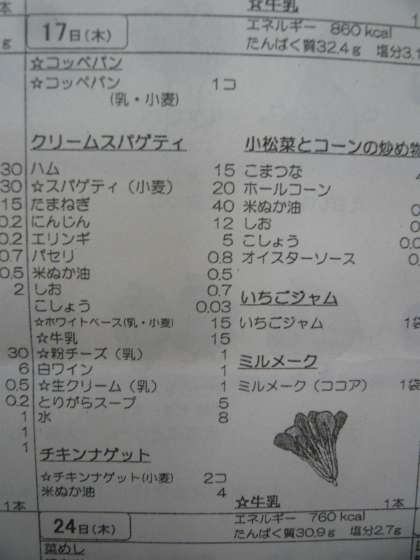 本日の給食の献立は、コッペパン、クリームスパゲティ、小松菜とコーンの炒め物、いちごジャム、ミルメーク、牛乳です。