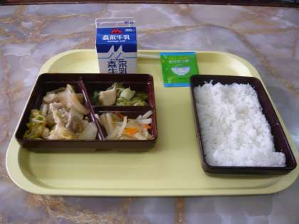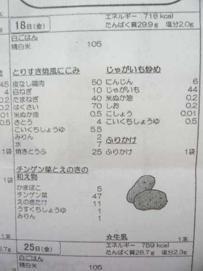 本日の給食の献立は、とりすき焼き風煮込み、チンゲン菜とえのきの和え物、じゃがいも炒め、ふりかけ、牛乳です。