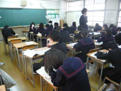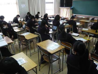 5限、3年3組は美術、「マイブック」に取り組んでいます。3年4組は社会、各種問題に取り組んでいます。