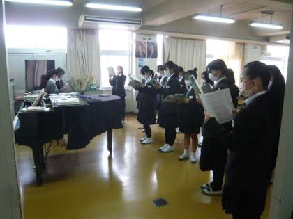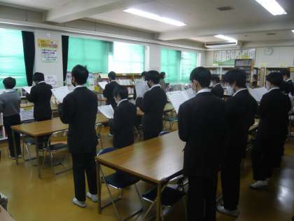 5限、1年2組は音楽、男女に分かれて合唱の練習です。
