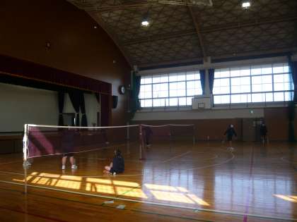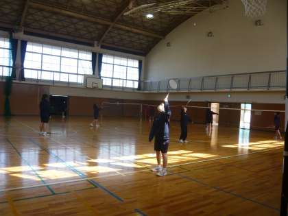 2限、2年3組は体育、女子は体育館でバドミントンです。個々に上に向けてシャトルを打っています。