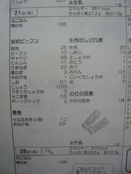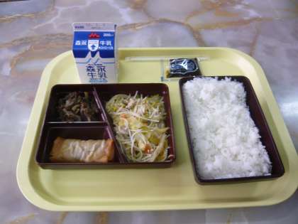 本日の給食の献立は、白ごはん、炒めビーフン、春巻き、牛肉のしぐれ煮、のりの佃煮、牛乳です。