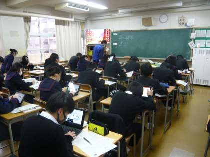 5限、3年3組は国語、プレゼンテーションの方法を学んでいるようでした。3年4組は理科、入試対策問題に取り組んでいます。