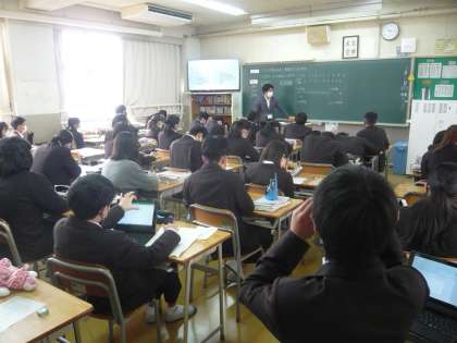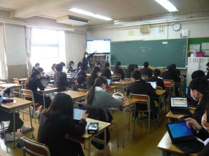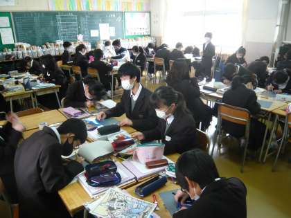 2限、1年1組は家庭、これからエコバッグの製作に入っていくようです。1年2組は美術、テスト返しの後、プッシュステンドの作品制作です。1年3組は数学、データの活用についての学習です。