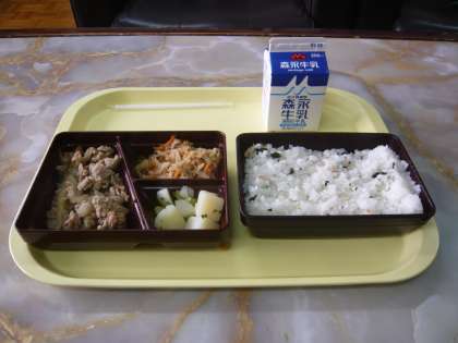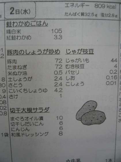 本日の給食の献立は、鮭わかめごはん、豚肉のしょうが炒め、切干大根サラダ、じゃが枝豆、牛乳です。