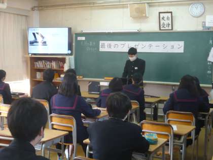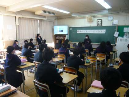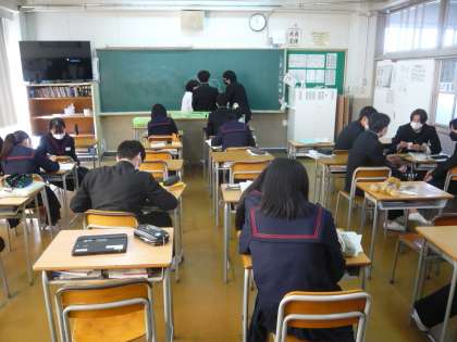 3限、3年1組は理科、各自で、またはグループで入試対策等に取り組んでいます。3年2組は各自作った資料でプレゼンテーションの発表をしています。資料の出来もプレゼンの内容も「すごい!」と思うものがありました。
