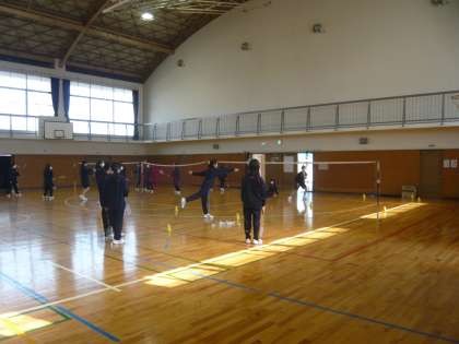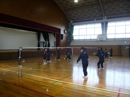 3限、1年1・2組の女子体育は、体育館でバドミントンです。1年3組は英語、大阪城を題材にした学習でしょうか。モニターに大阪城が映し出されています。