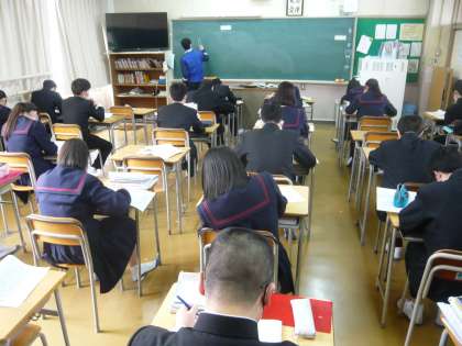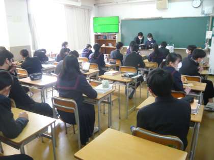4限、3年1組は英語、何か発表の準備をしているようです。3年2組は理科、入試対策の問題をしていました。