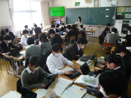 4限、2年1組は国語、それぞれの班に出された課題についてメリット、デメリットを考えて話し合います。2年2組は理科、冬の天気について学習しています。2年3組は英語、自習課題に取り組んでいます。