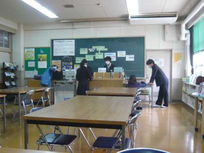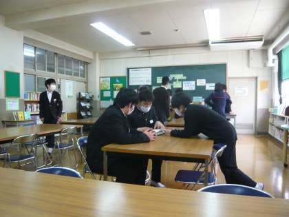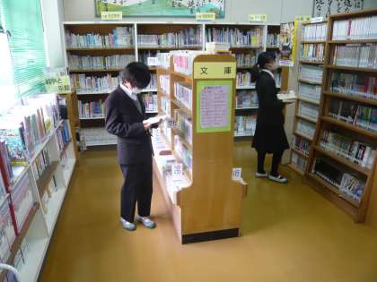 昼休みの図書室の様子です。図書委員が貸し出しを行っています。3年生は、今週は貸し出しはできません。それでも昼になるとたくさんの3年生がやってきます。
