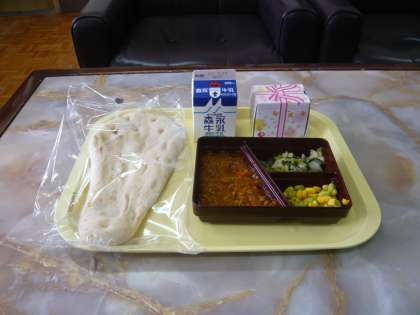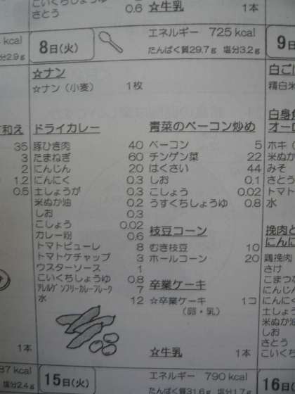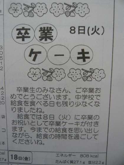本日の給食には卒業ケーキがつきました。本日の献立は、ナン、ドライカレー、青菜のベーコン炒め、枝豆コーン、卒業ケーキ、牛乳です。