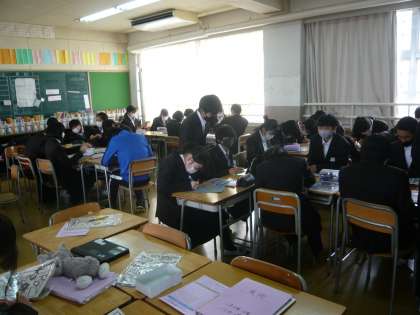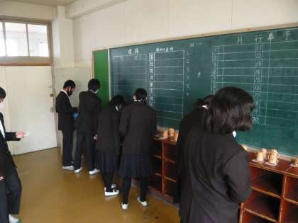 4限、1年3組は美術、プッシュステンドの制作をしながら、焼きあがった埴輪に名札をつけに行っています。
