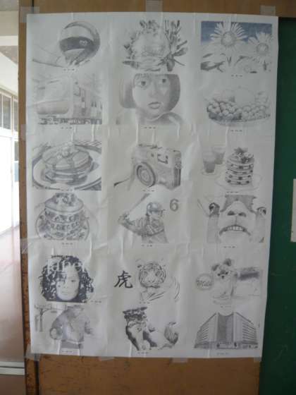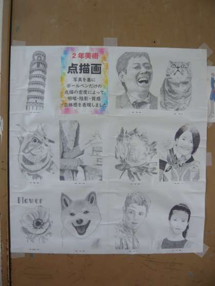 2年生の美術で制作した点描画の優秀作品が掲示されています。