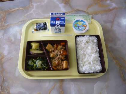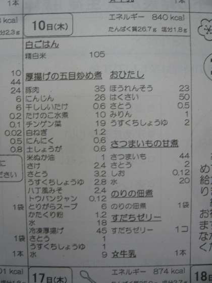 本日の給食の献立は、白ごはん、厚揚げの五目炒め煮、おひたし、さつまいもの甘煮、のりの佃煮、すだちゼリー、牛乳です。
