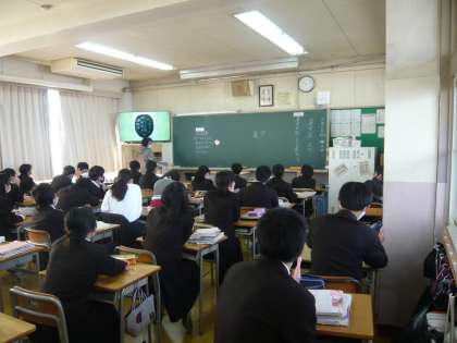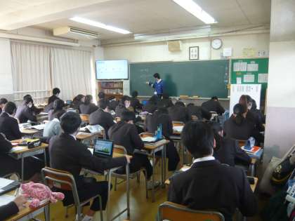 2限、1年1組は英語、自分のハマっているものや人についてスピーチをしています。1年2組は国語、漢字の成り立ちを学んでいます。1年3組は理科、地震の計算について学習しています。