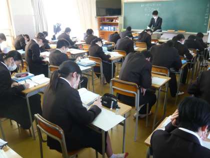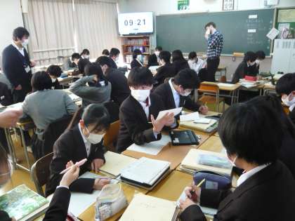 3限、2年1組は英語、班ごとに班員同士でインタビューをするという取り組みをしてます。2年2組は数学、自習課題に取り組んでいます。