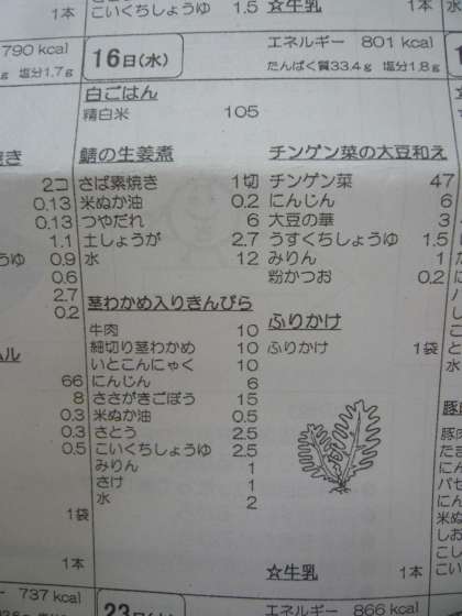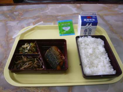 本日の給食の献立は、白ごはん、鯖の生姜煮、茎わかめ入りきんぴら、チンゲン菜の大豆和え、ふりかけ、牛乳です。