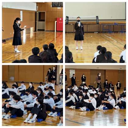 1年生は6時間目、部活動紹介がありました。生徒会の進行で各部の先輩が自分の部を紹介してくれました。先輩はこの日のために打ち合わせをしてくれていたようです。