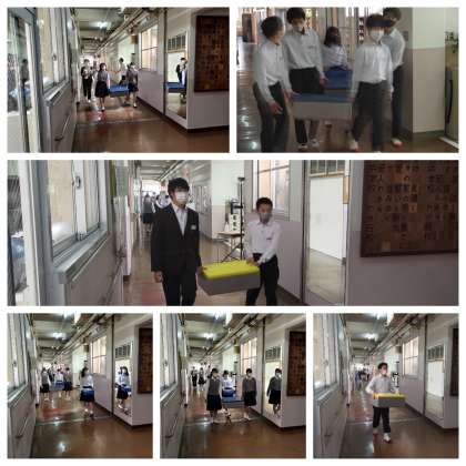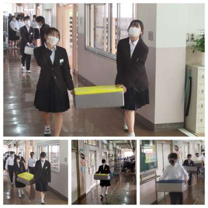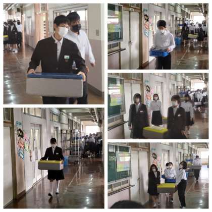 給食の配膳の様子です。クラスのみんなの為に係の生徒が自分のクラスまで給食を運んでくれています。ご苦労様。