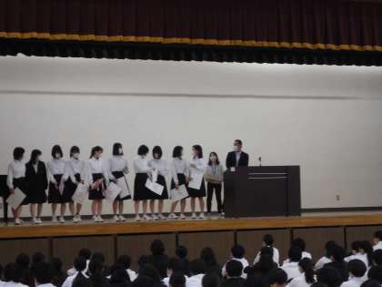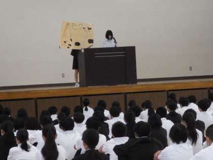 今朝は全校集会がありました。バドミントン部の表彰、校長講話、保健給食委員会の話、生徒会の話がありました。