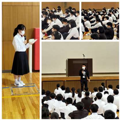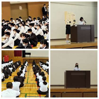 集会の様子です。生徒指導の先生から登下校時、車などの交通量が多い所での安全確保についても話しがありました。