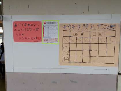 教育委員会の営繕班の方に学年の掲示板を作ってほしいとお願いしました。先日、手作りの掲示板が完成したので、学年の様子や委員会の報告等、それぞれの学年で利用することになりました。