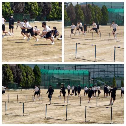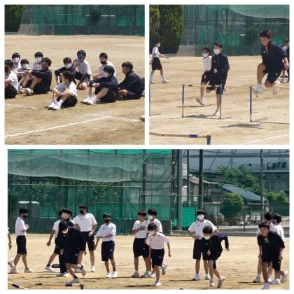2年生男子の体育はハードルでした。いくつかのグループに分けて短い距離のハードル走を練習した後、グループ対抗でリレーを行っていました。