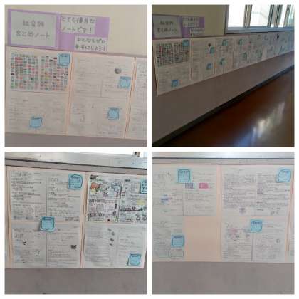 一年生のフロアに社会科のノートのコピーが掲示されました。まとめ方が素晴らしいノートを紹介してあります。休み時間に掲示物の前で立ち止まって見ている一年生の様子もありました。