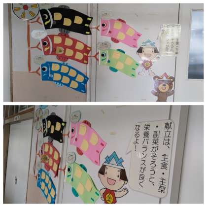 配膳室前には、鯉のぼりとともに色に関するメッセージが記されています。