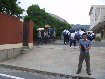 小雨の中、PTA委員の皆様が登校する谷中生に「おはようございます」の挨拶の声をかけてくださっています。