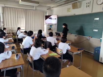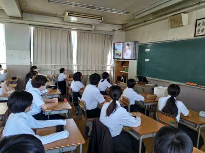 1時間目、一年生は情報モラル学習を行っています。スマホによる不適切な情報発信について動画を見て、その後、話し合いながら学習する予定です。