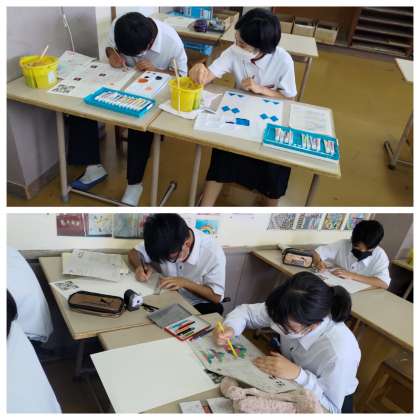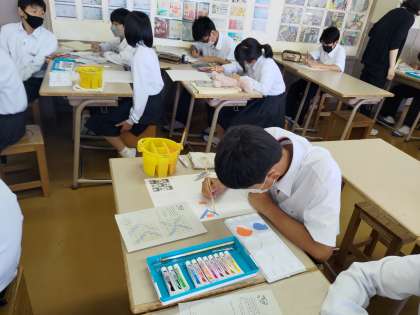 美術の時間です。一年生です。デザインの後、彩色します。