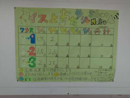 写真1枚目は1年生の新たな取組みの掲示物です。授業では号令時や起立したとき、また、班に机を移動する機会がよくあります。前後、横の他クラスへの配慮は心がけたいものです。