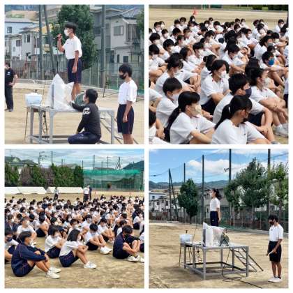 明日は天気が雨予報で心配な状況です。生徒には、実施か順延については、7時にホームページで知らせするので確認するように伝えています。(登録していただいている緊急メールにもお知らせします。)