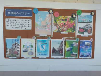 写真は1年生のフロアに掲示されていた、「学校紹介ポスター」の優秀作品です。谷中の魅力を伝えるキャッチコピーを考え、クラスで相互評価したものだそうです。国語科の学習の一環です。