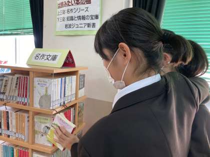 名作文庫の棚も人気で、手に取って本を開く姿です。