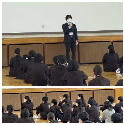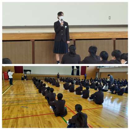 写真は2年生の学年集会の様子です。今日までの3週間、教育実習で谷中に来ていた先輩がから離任のあいさつがありました。実習中の感謝とこれからの励ましを話しておられました。3週間お疲れさまでした。素敵な先生になられることを祈っています。