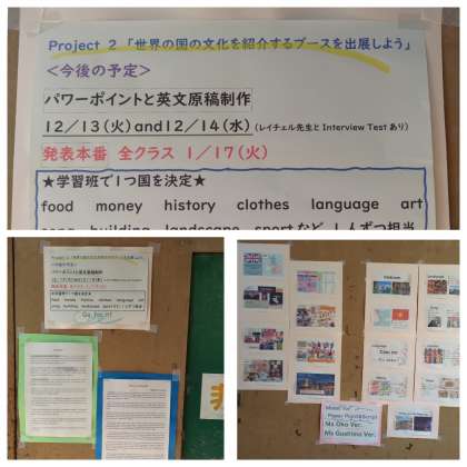 写真は3年生のフロアの掲示物(英語)です。新しくなりました。世界の国の文化を紹介する作品についての掲示物です。