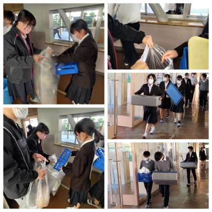 給食の後は片付けです。今日はミカンもあります。ミカンの皮の回収の仕方は大丈夫ですか? 係の人、ご苦労様でした。