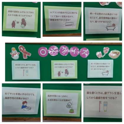 写真は保健室前の掲示物です。健康に関する内容について、時期やテーマに合わせて工夫した掲示物を掲示してくれています。